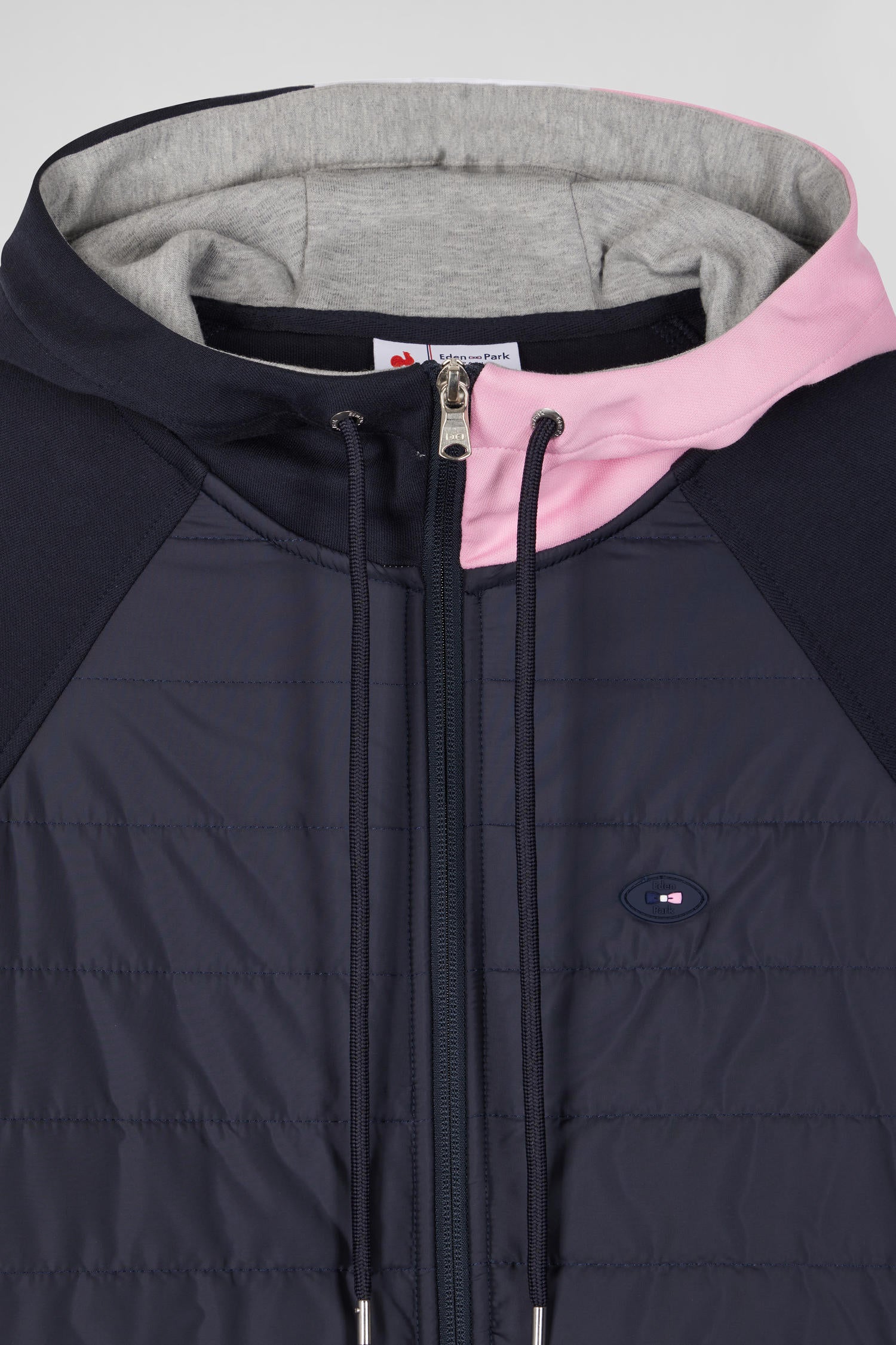 Adopt a versatile outfit with this hybrid model, half sweatshirt, half mid-season jacket. Its timeless color is combined with quilted trims reminiscent of a light down jacket, perfect for the arrival of autumn. The hood, adorned with tricolor stripes, echoes Eden Park's take on French elegance, while the XV de France badge is a proud reminder of our House's passion for rugby. Ideal for a sporty look or a casual outing, this hoodie is the epitome of athletic chic.