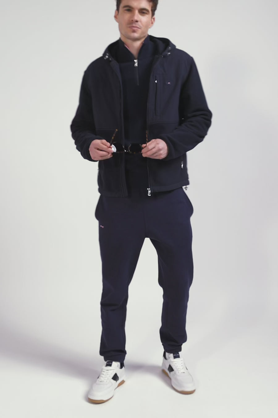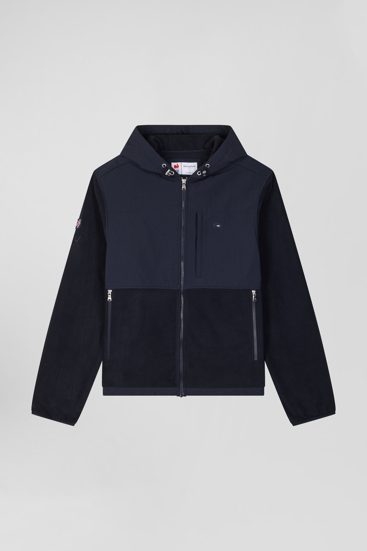 This navy blue sweatshirt with straight zip and integrated hood can be worn as a sweatshirt or a mid-season jacket. Zip pocket details add practicality and structure to this masculine two-tone sweatshirt. Contrast piping and sleeve embellishments underline the care we take with every detail of our wardrobe.