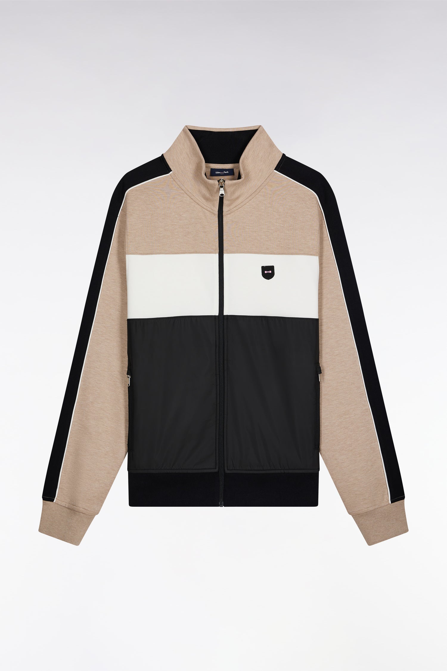 This high-neck zip-up sweatshirt revisits sporty codes with a bold tricolor construction and contrasting nylon inserts. Crafted in comfortable interlock, it boasts a structured, athletic look, highlighted by flat piping along the sleeves. Contrasting collar inserts, metal trims and ribbing add style and support. Available in two color versions