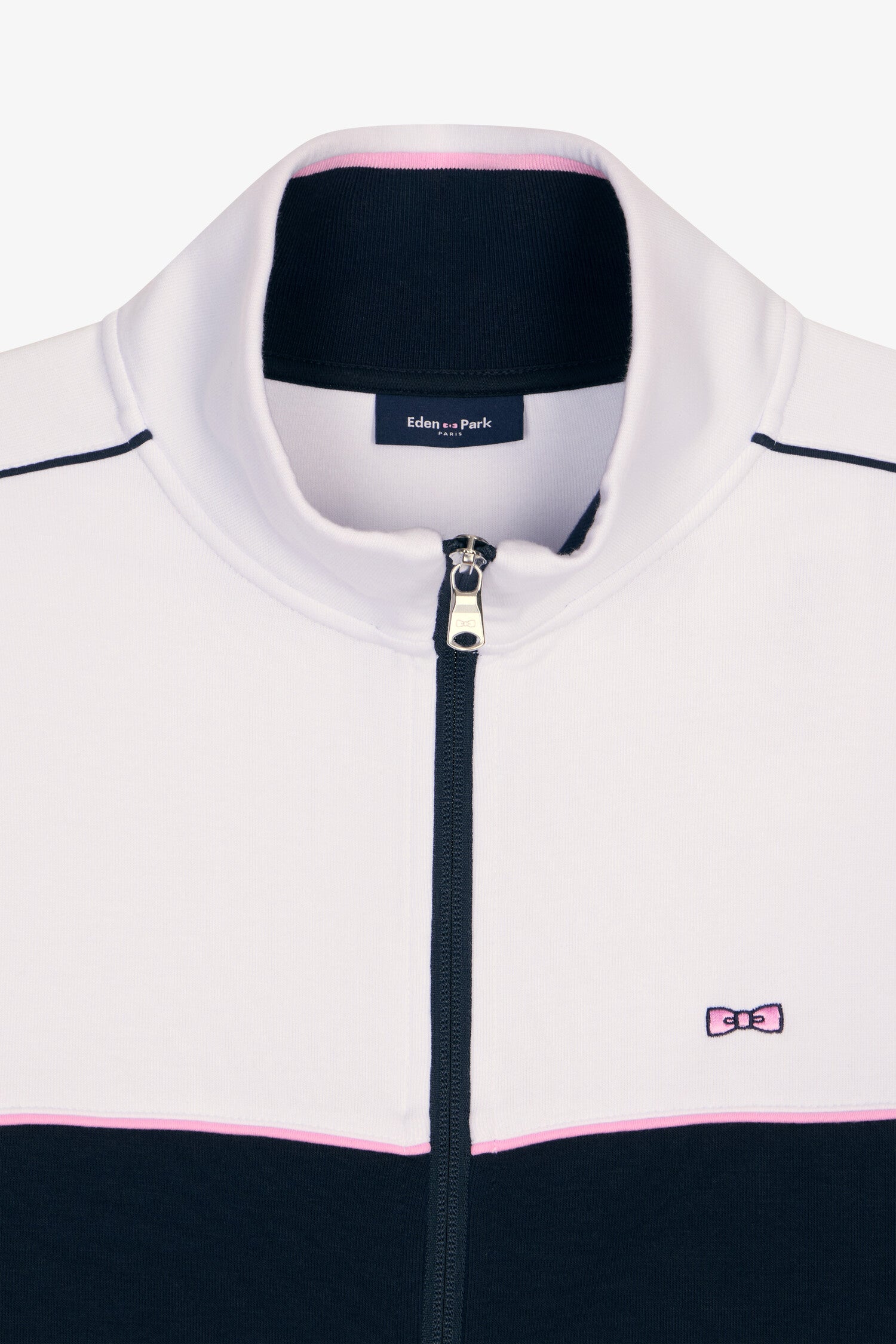Ce sweatshirt zippé conjugue confort et détails identitaires. Sa bande marine rehaussée de passepoils roses, rappel des détails soulignant ses découpes de manches, signe une pièce essentielle du vestiaire sport chic. En molleton doux, ce sweatshirt structuré assure confort et maintien pour la vie urbaine. Un modèle aux finitions soignées à retrouver sur le polo en coton et le short en molleton assortis.