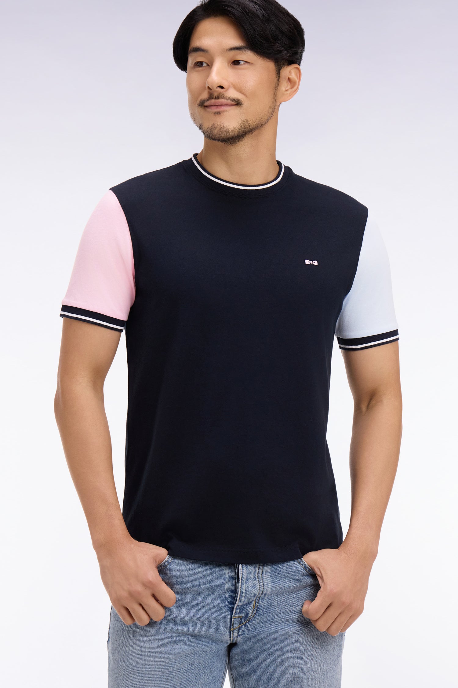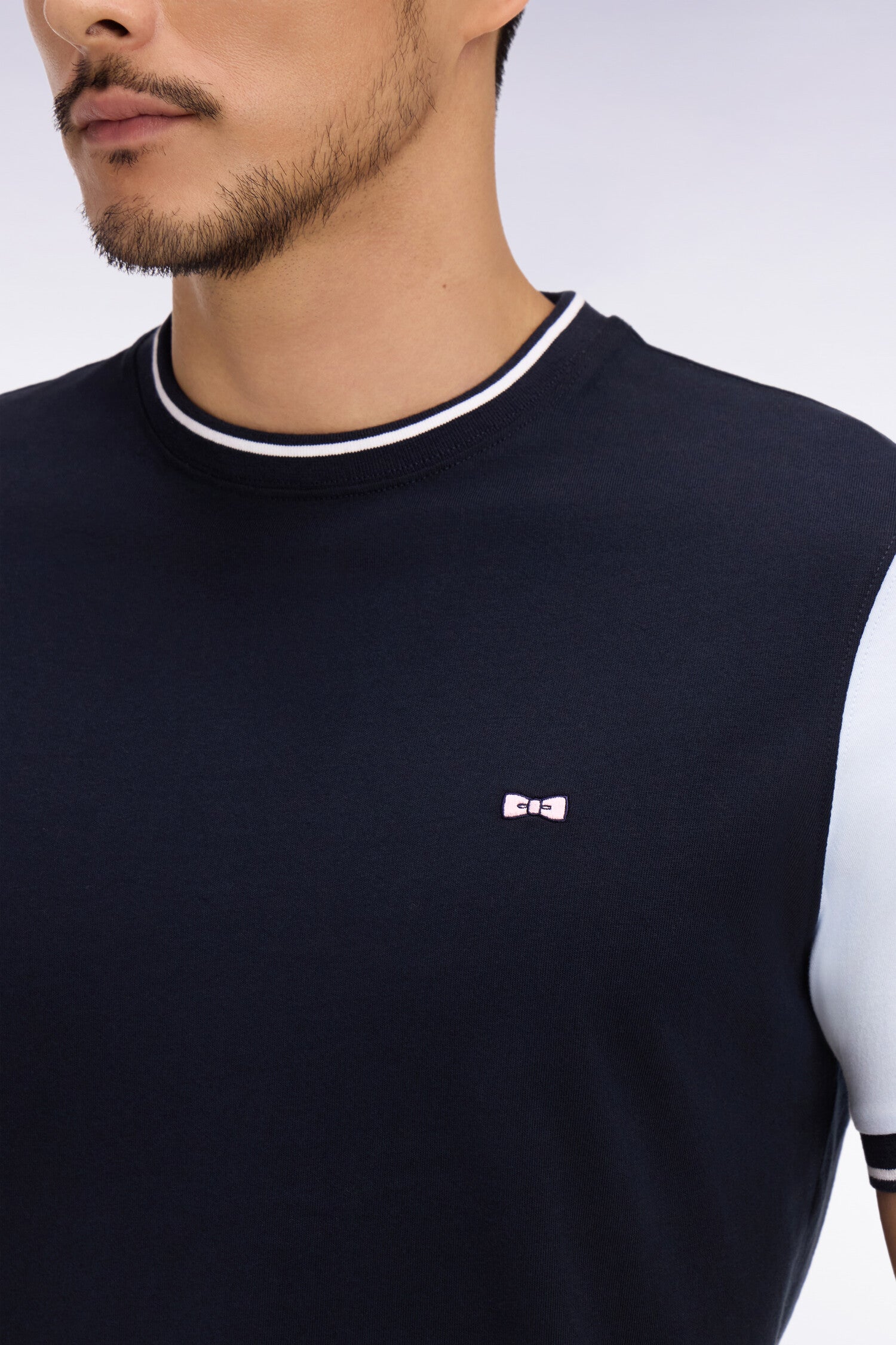 This two-tone short-sleeved T-shirt is distinguished by a balanced play of contrasts and a straight cut with a clean construction. Its cotton jersey material ensures a pleasant and light fit, while its back embroidery and knitted ribbed edges with a striped finish bring a sporty touch to your everyday wardrobe.