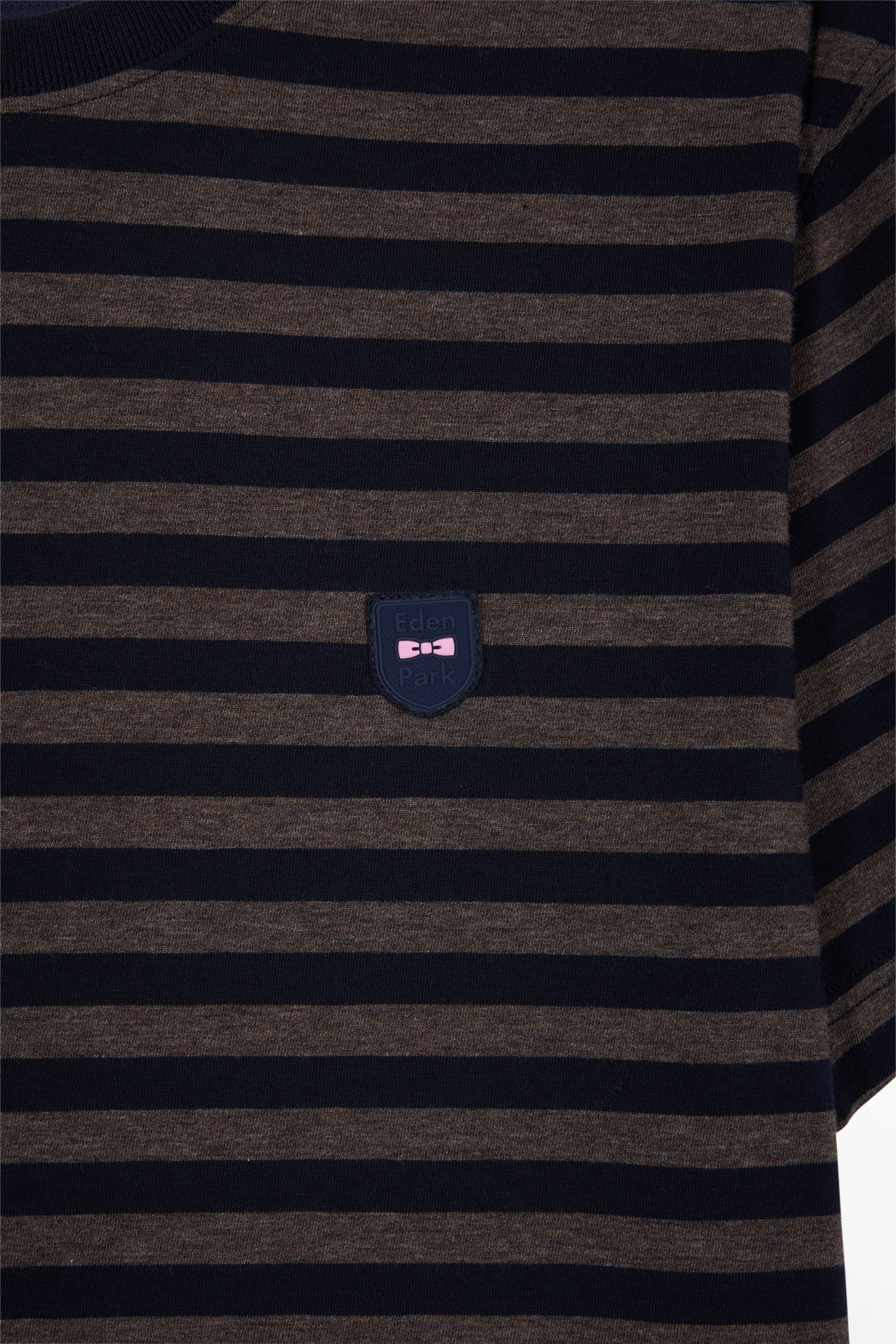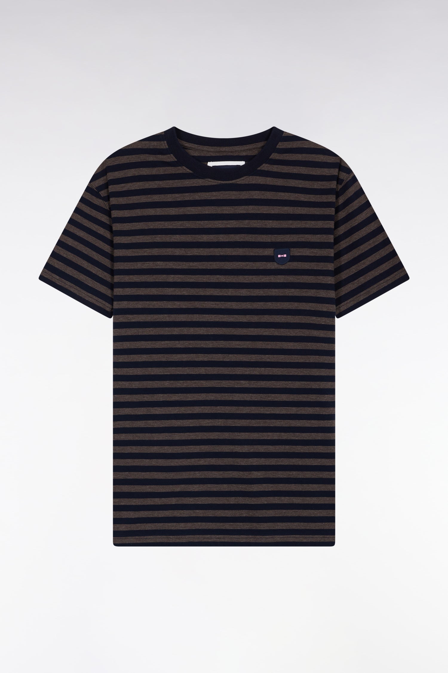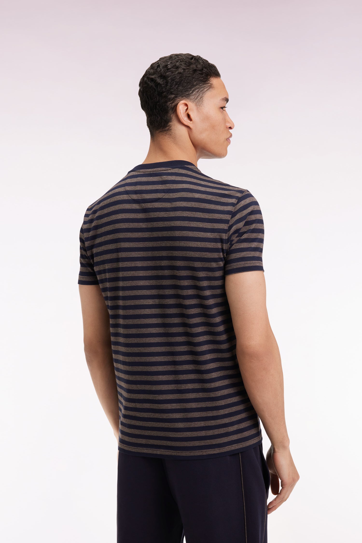 Designed to move with fluidity, this T-shirt in stretch cotton jersey revisits a men's wardrobe essential in a refined, athletic version with horizontal stripes. Its slim, fitted cut emphasizes the silhouette without constricting it, while its round collar with contrasting ribbing ensures a long-lasting fit. A modern essential featuring our signature crest