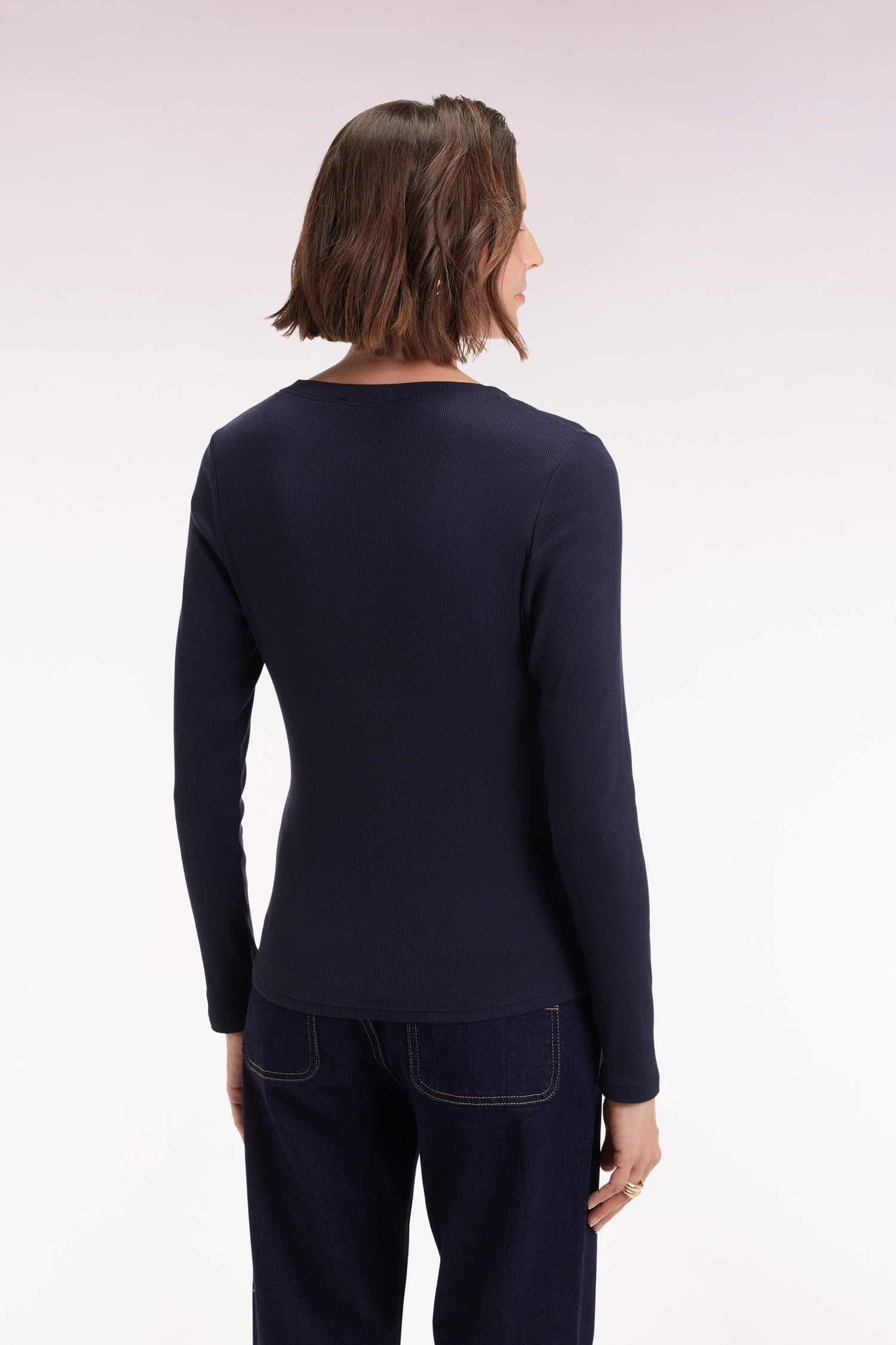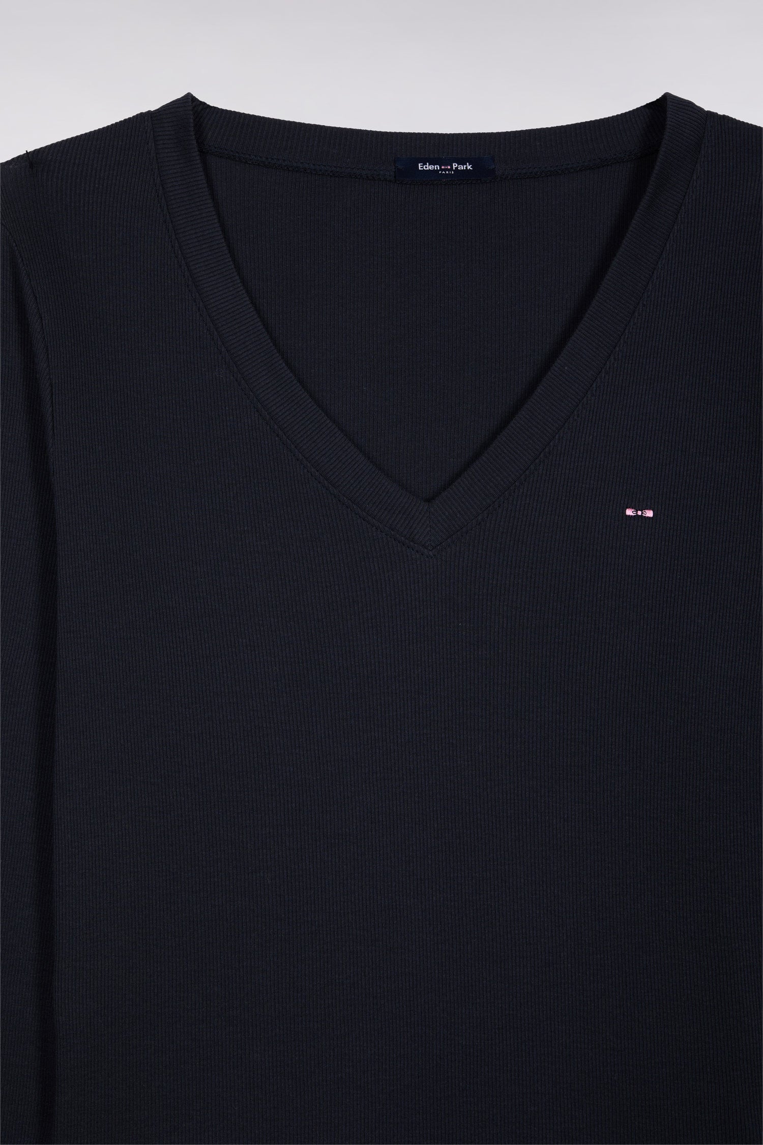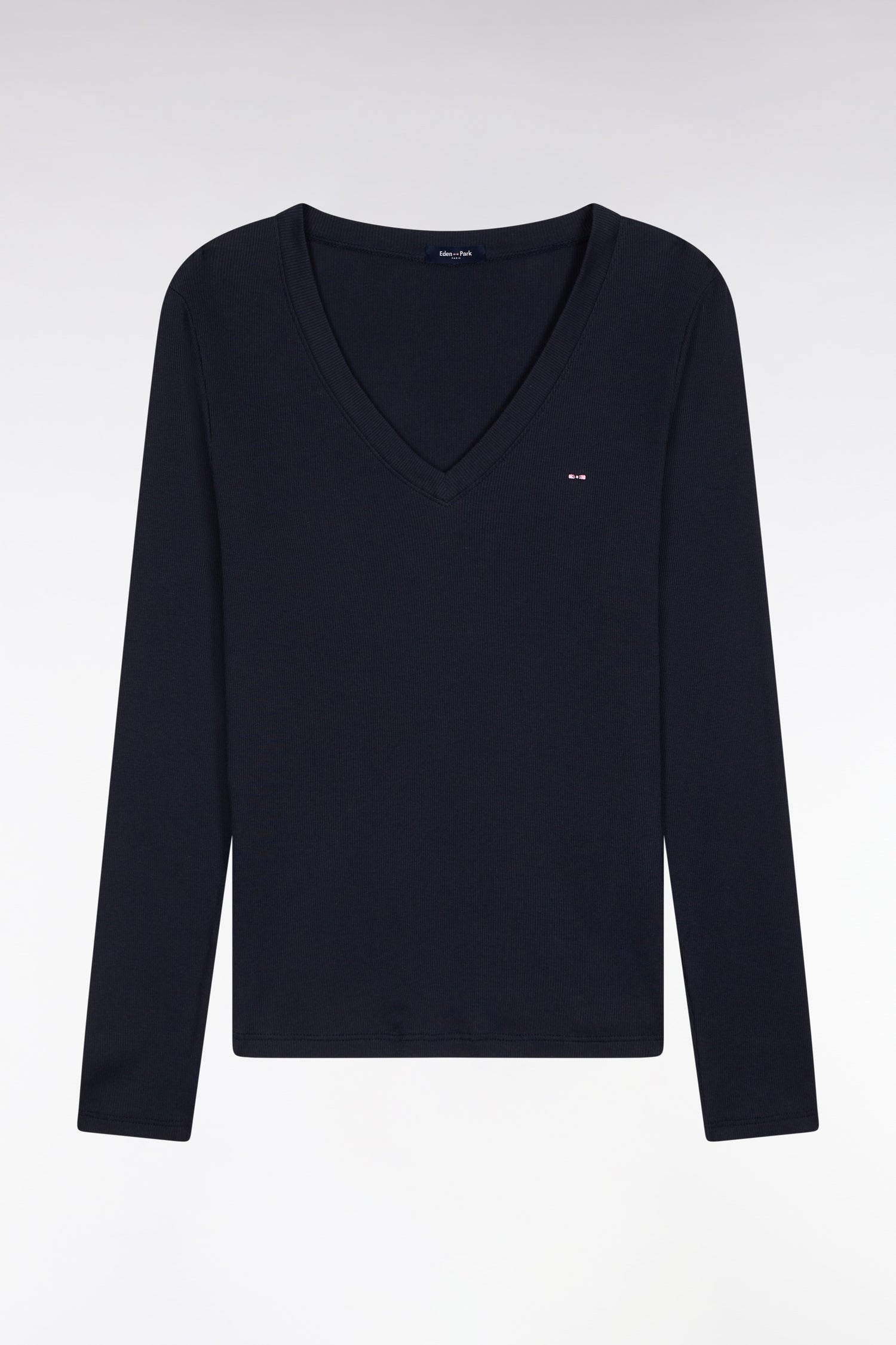 With its ribbed Pima cotton fabrication, this long-sleeved V-neck T-shirt combines second-skin comfort with feminine allure. A timeless essential in a smart slim fit and three sober shades, easy to wear all season long.