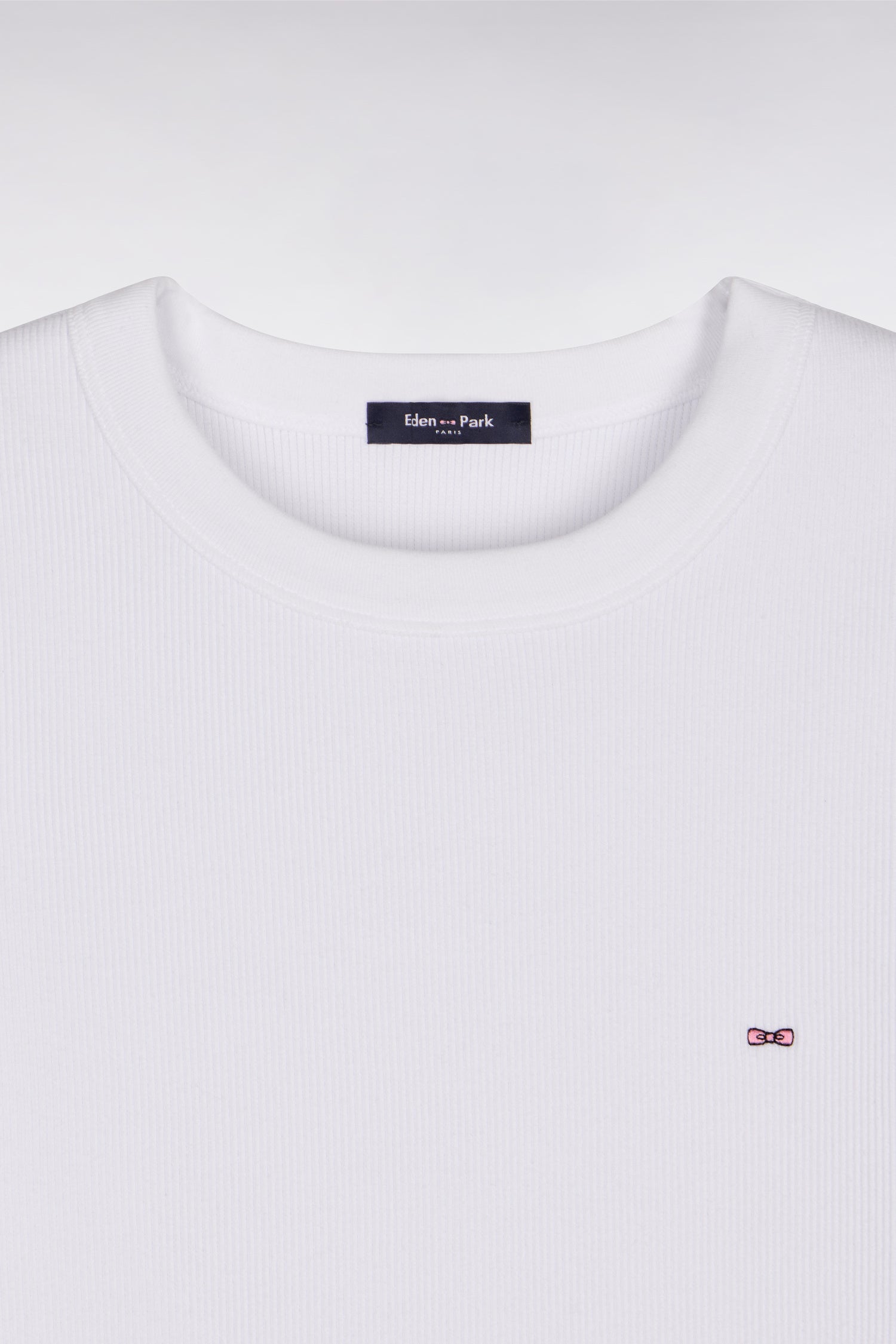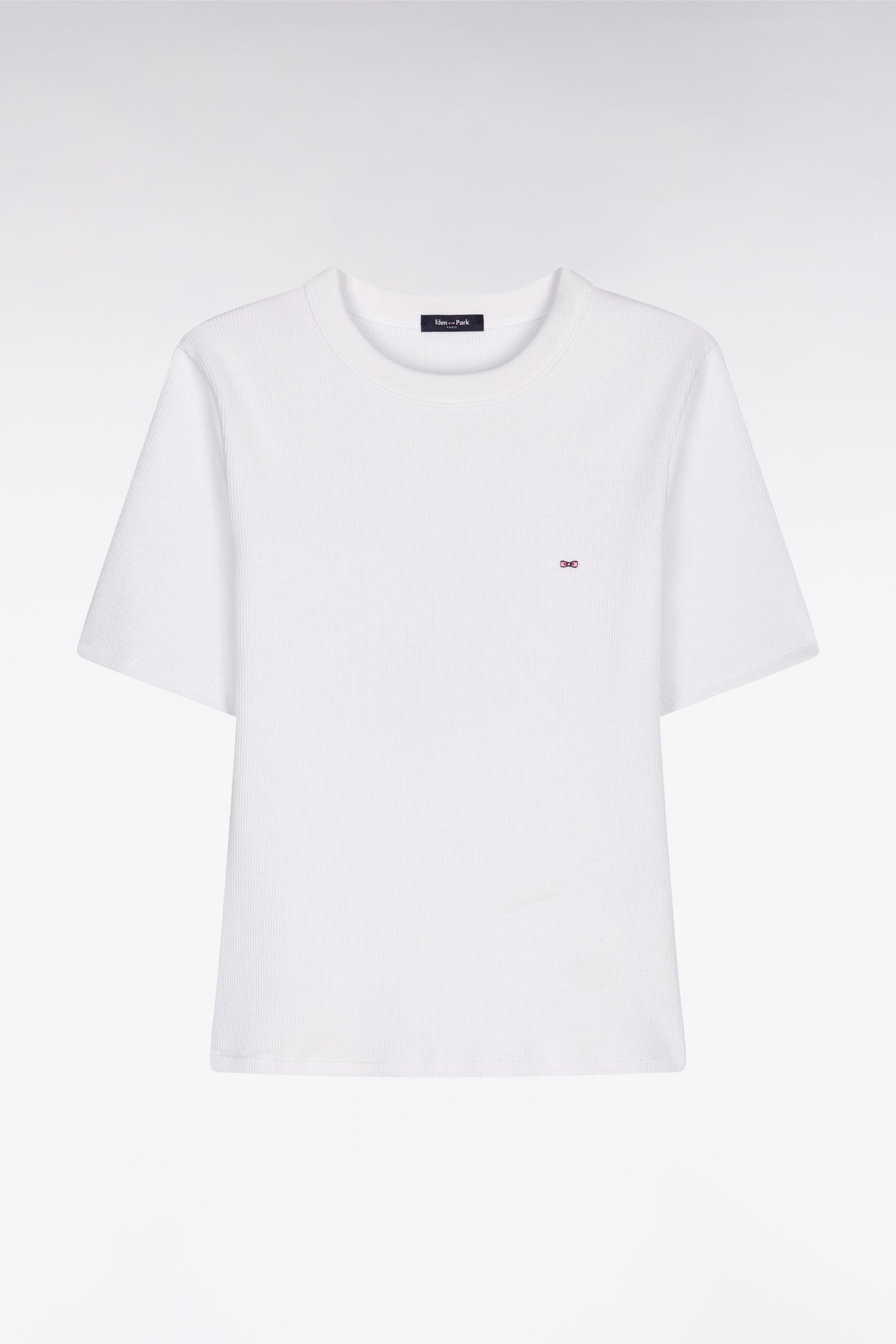 Ce T-shirt femme encolure ronde à la coupe slim ajustée est confectionné en modal et coton pour vous offrir un toucher naturellement doux et confortable. Son tricotage côtelé met subtilement en valeur la silhouette, tandis que le nœud papillon rose brodé sur la poitrine signe cet intemporel avec discrétion. À porter sous une chemise ouverte, glisser dans un jean taille haute ou à associer à un cardigan léger pour une allure effortless chic en toutes occasions.