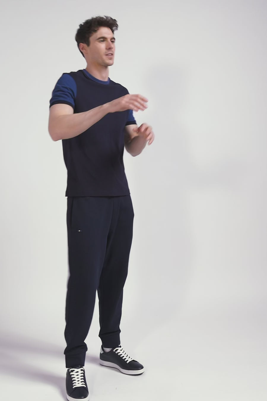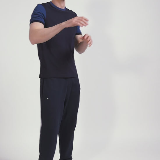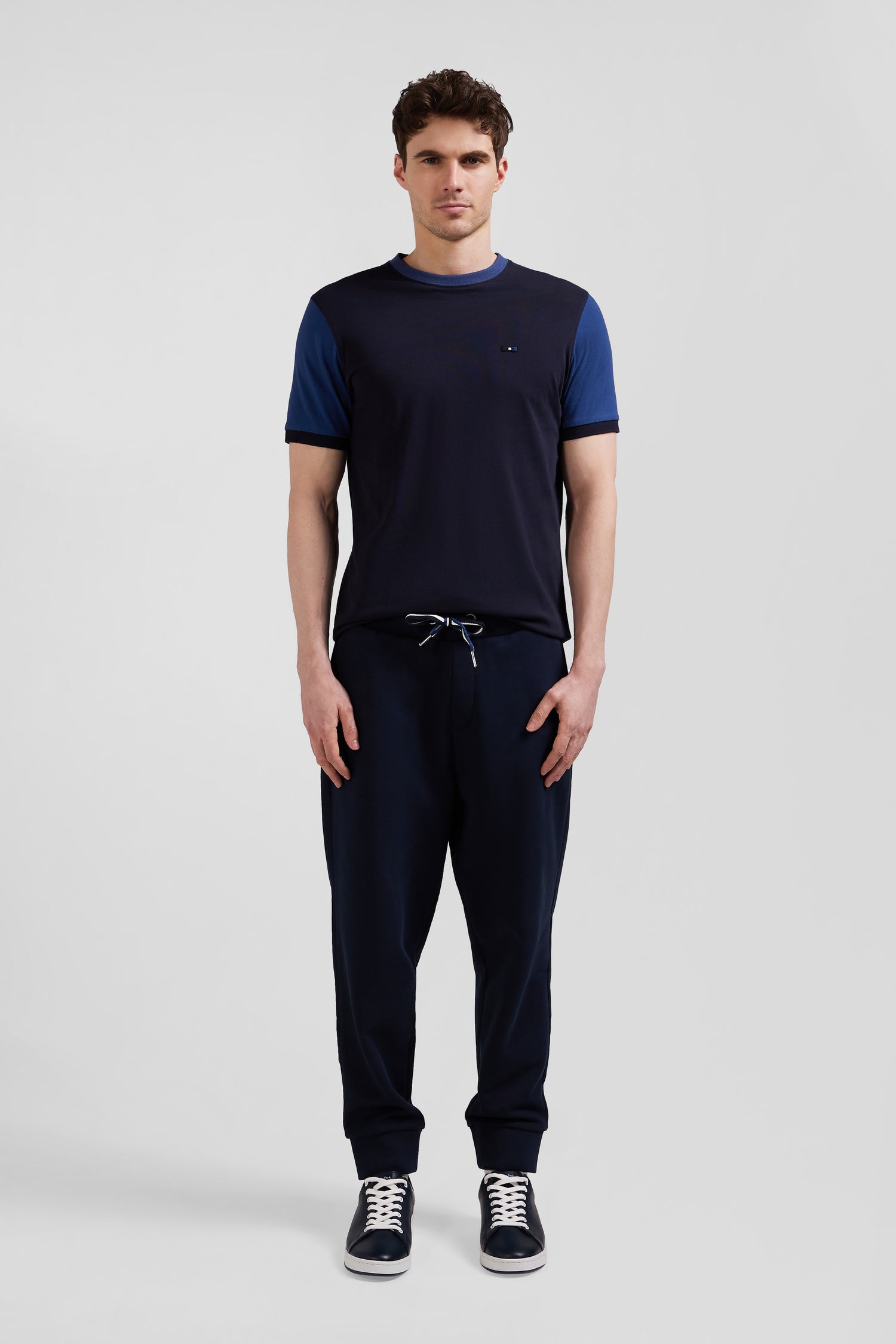 Regular navy blue cotton T-shirt with short contrasting sleeves