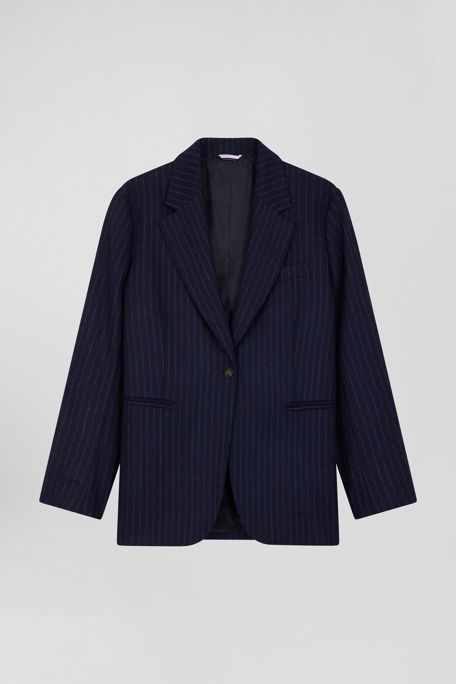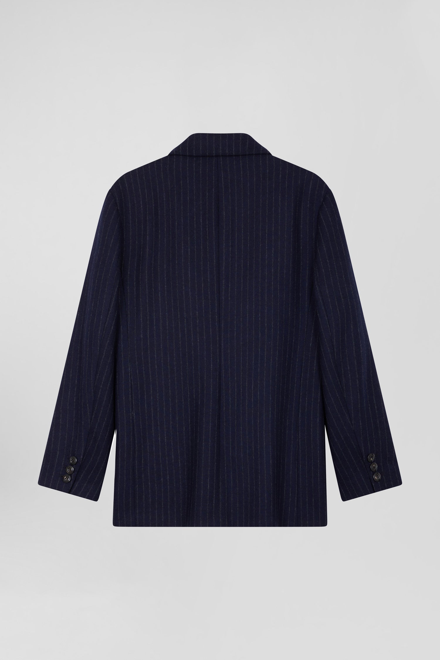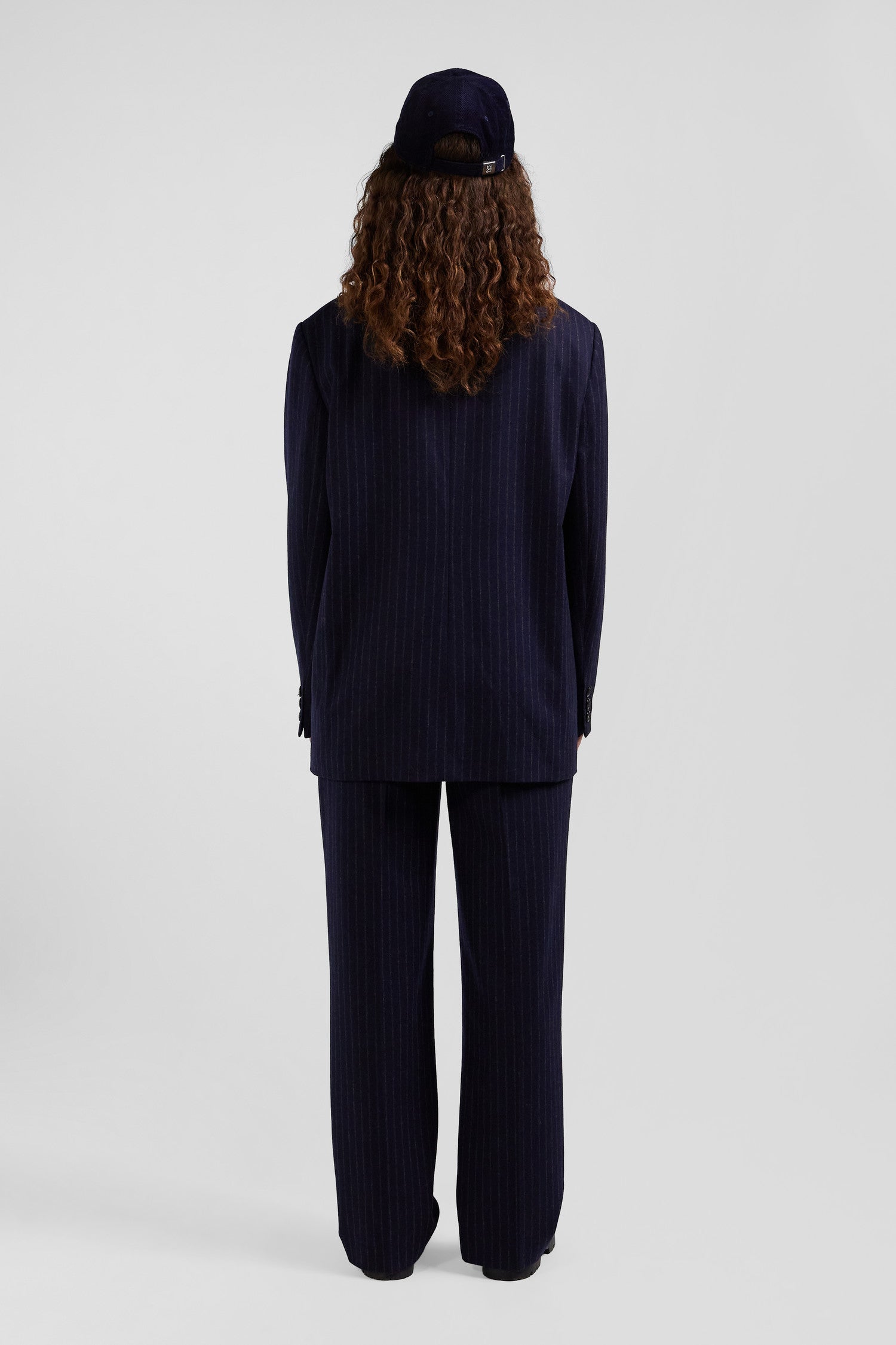 This navy-blue wool blazer, characterized by vertical white stripes known as "chalk stripes", features a modern Oversized cut that's wildly on-trend. Ideal to wear with matching pants for a complete feminine suit revisited, this navy suit jacket offers a sophisticated and sharp approach to traditional tailoring. Perfect for business events or more androgynous days out.