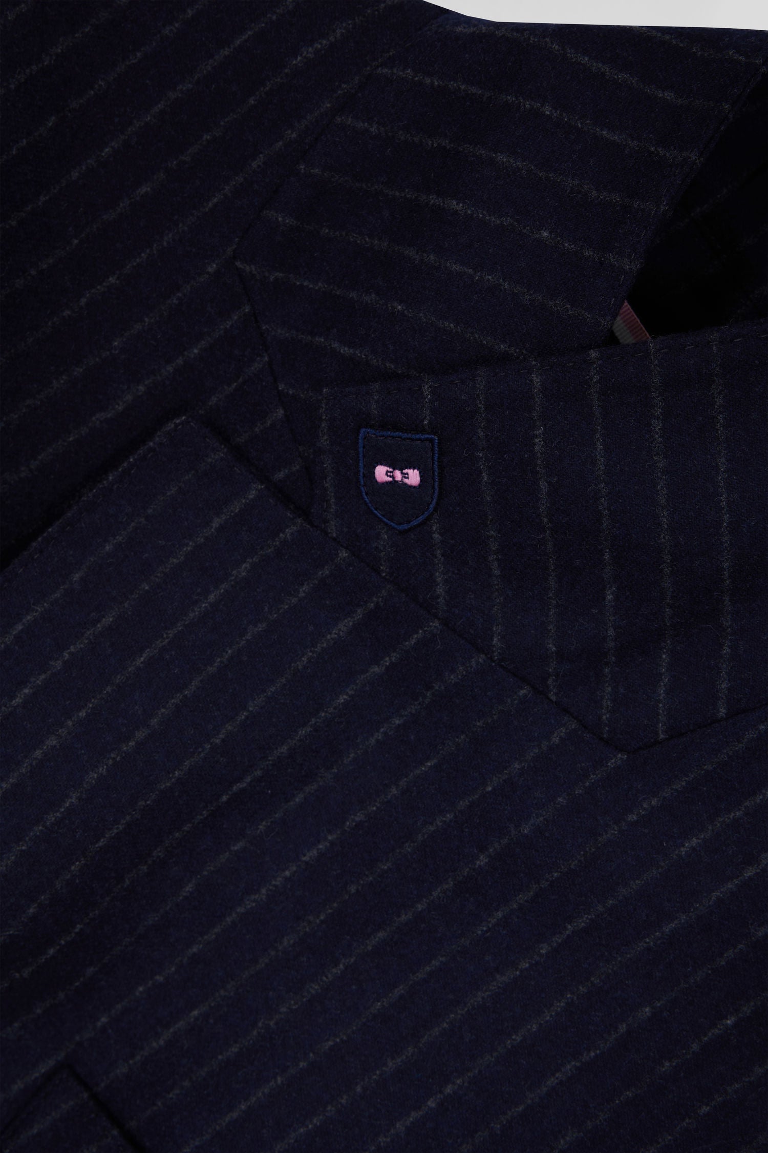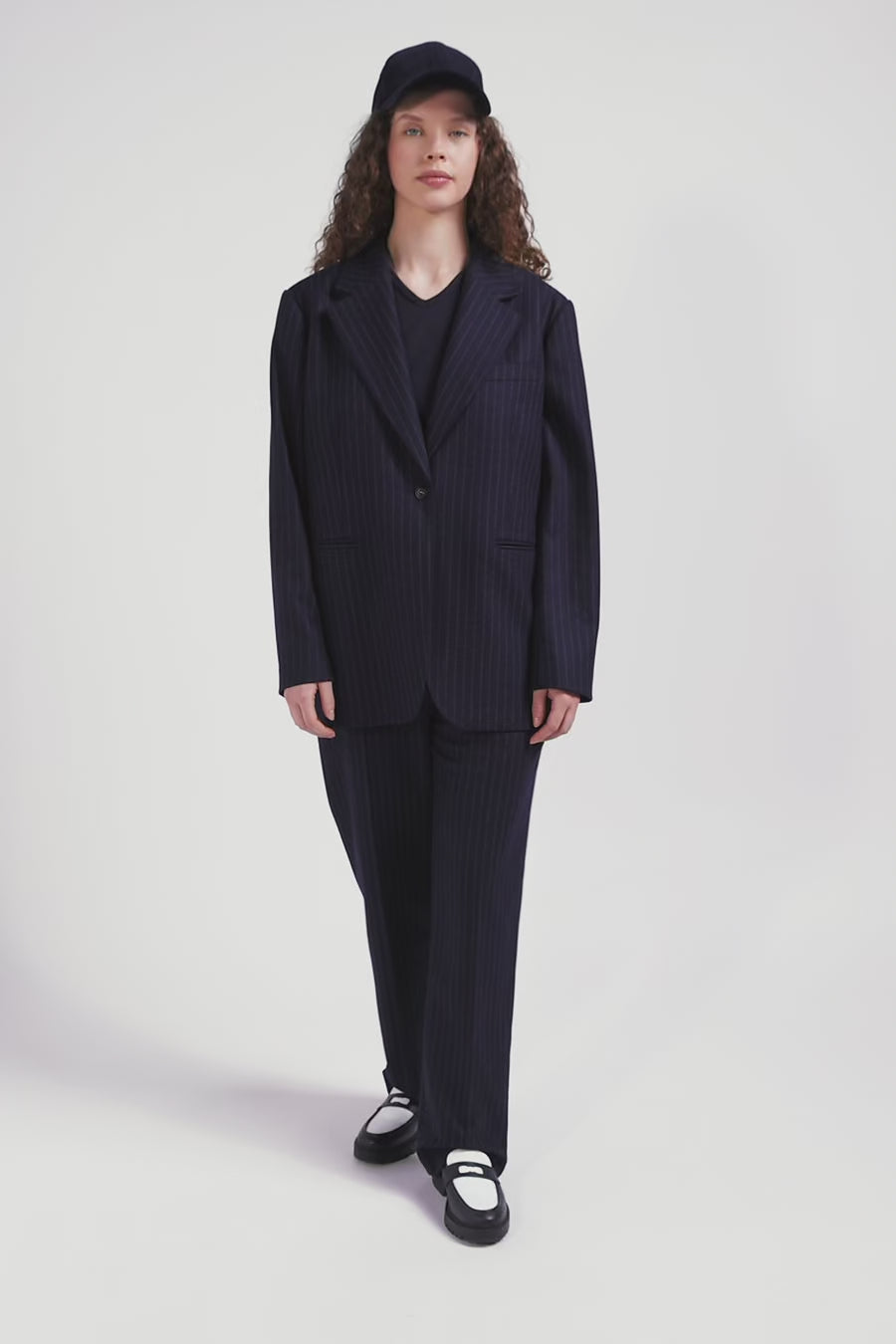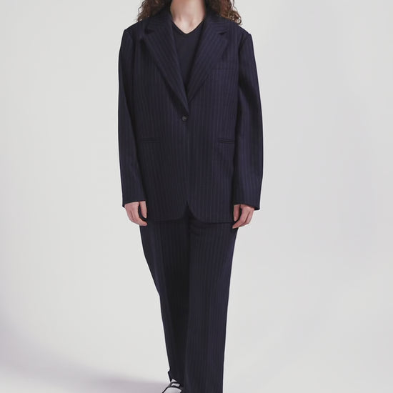 This navy-blue wool blazer, characterized by vertical white stripes known as "chalk stripes", features a modern Oversized cut that's wildly on-trend. Ideal to wear with matching pants for a complete feminine suit revisited, this navy suit jacket offers a sophisticated and sharp approach to traditional tailoring. Perfect for business events or more androgynous days out.